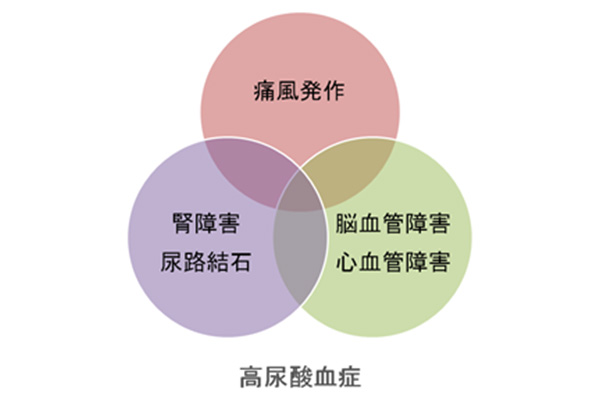 また、尿酸値が高いと痛風になるということはよく知られていることですが、高尿酸血症を放置していると、尿路結石や腎障害、心血管障害や脳血管障害のリスクとなることも示されています。