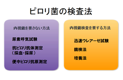 内視鏡検査を要さないものとしては、採血、採尿でピロリ抗体を調べる検査、便中のピロリ抗原を調べる検査、尿素呼気試験があります。