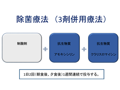 現時点で比較的効果の高いといわれている抗生剤(シタフロキサシン)を使用して除菌をおこないます。70~70%の除菌率となります。