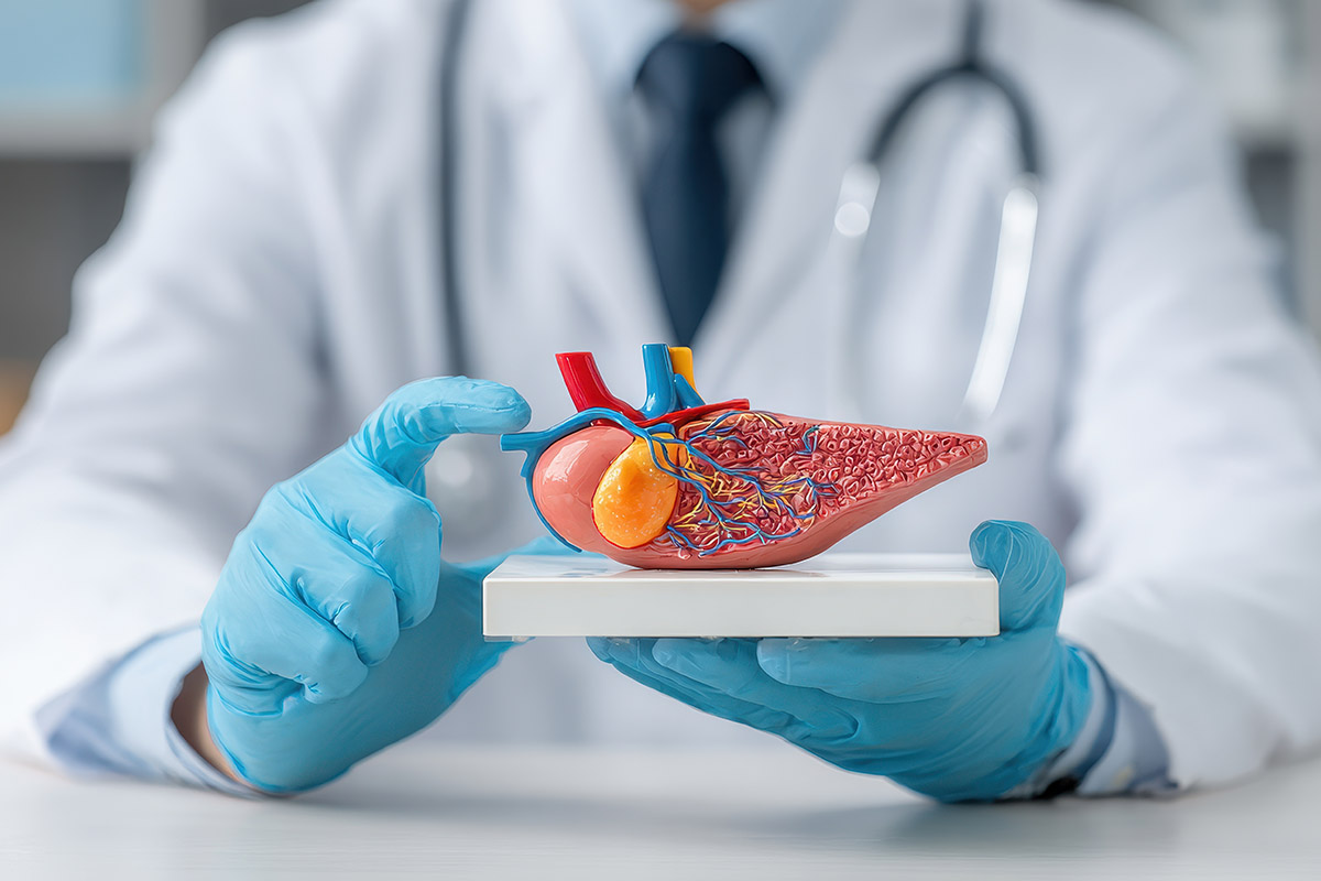 肝臓は内臓の中で一番大きな臓器で、この肝臓で1日に約500~800mlの胆汁が作られます。この胆汁は胆管を通り膵管と合流し、膵臓から排出される膵液と共に十二指腸へと分泌され、脂肪や炭水化物の消化を助けています。 胆のうは食べ物の消化吸収を助ける胆汁を溜める役割を持ちます。